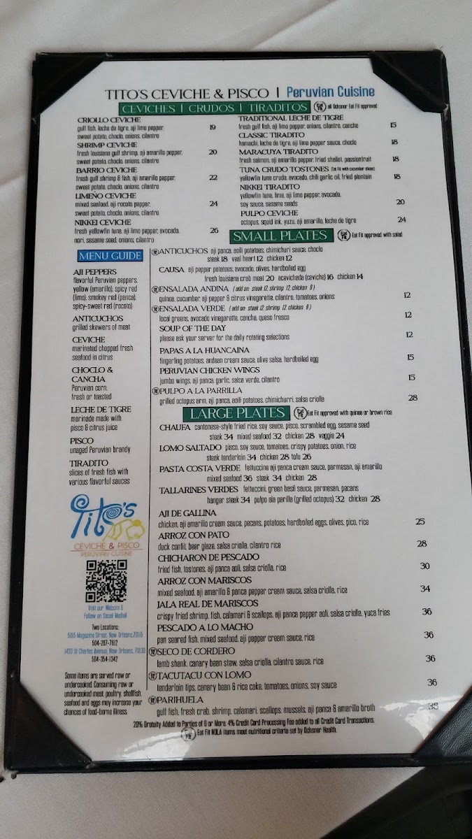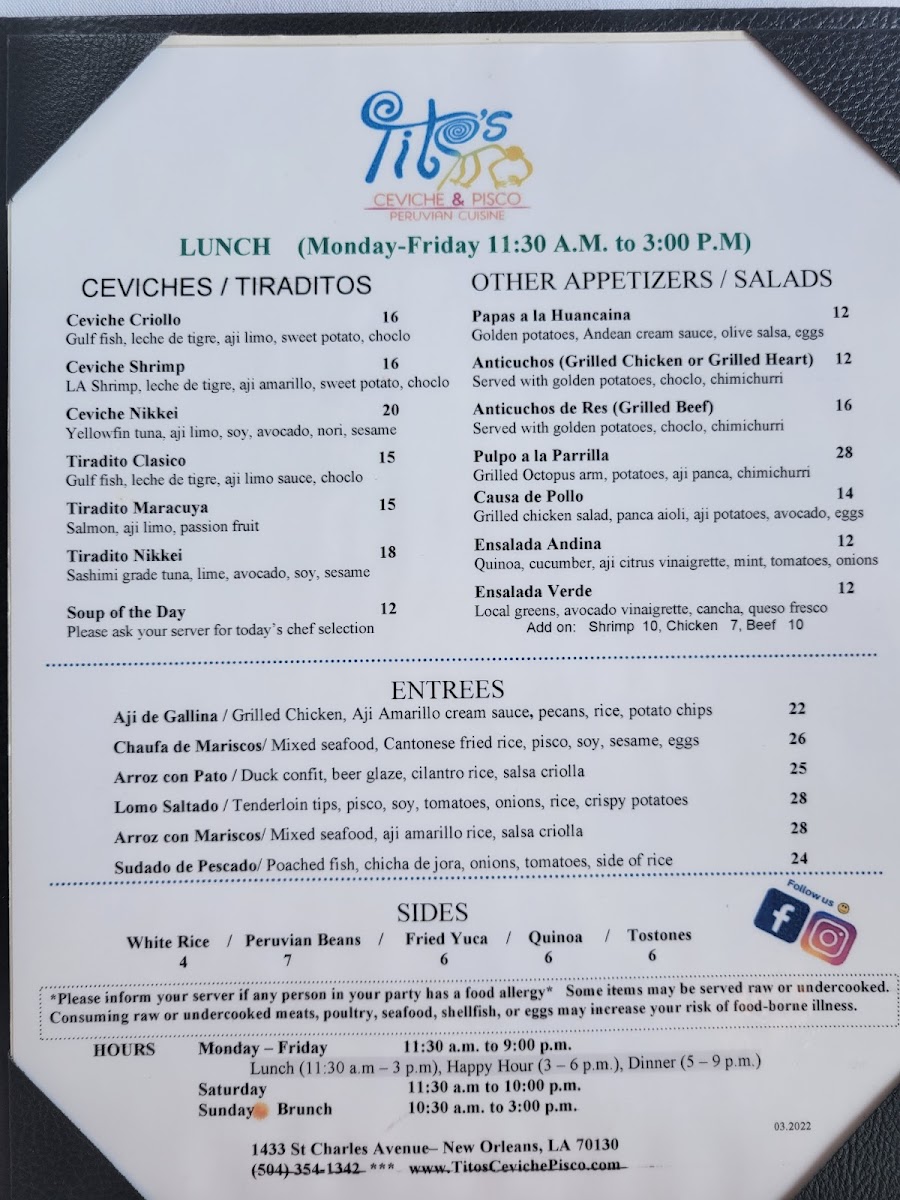 Welcome to Tito's Ceviche & Pisco, a delightful Peruvian escape nestled at 1433 St Charles Ave, New Orleans. This culinary gem has garnered rave reviews for its authentic dishes and vibrant flavors. Customers are enamored with the impressive ceviche and exquisite pisco cocktails, including creatively infused varieties that elevate the dining experience.